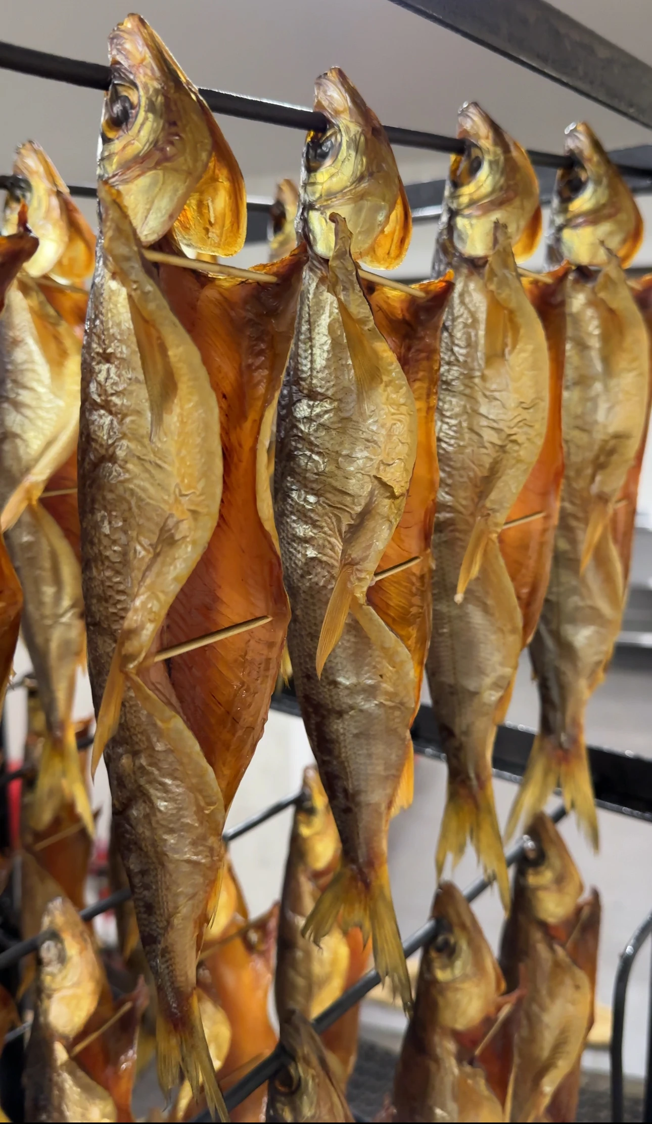 Готовится 3 дня. Сначала рыбу потрошим, промываем, солим тузлуком. Затем накалываем на клети и сушим в провялке. После этого коптим в дыму на опилках. Рыбка получается золотистая, ароматная.