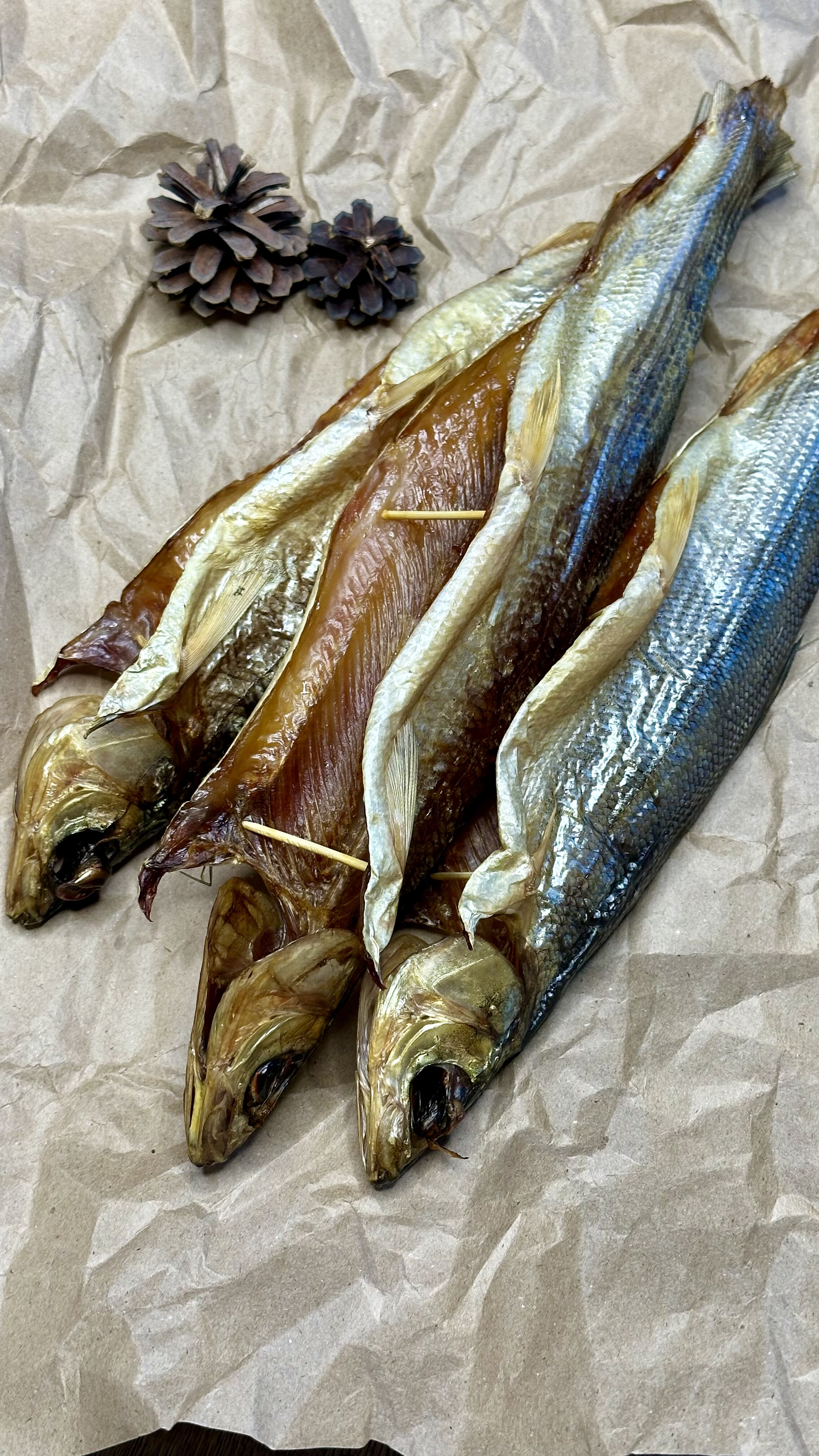 Готовится 3 дня. Сначала рыбу потрошим, промываем, солим тузлуком. Затем накалываем на клети и сушим в провялке. После этого коптим в дыму на опилках. Рыбка получается золотистая, ароматная.